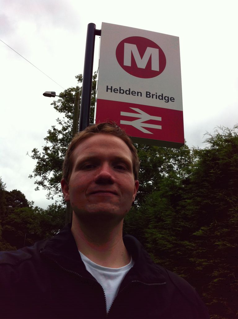 Photo of Robert in front of the Hebden Bridge signTo business, then. I toddled on down to the main road to get the required station sign picture. I don’t seem to have quite mastered the art of actually smiling for photos yet.