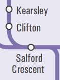 Extract from network map showing Clifton station, between Kearsley and Salford CrescentFrustratingly, this was not the case – we were actually slowing to stop at a signal, and the train came to a halt just outside the station. The total wait was only about a minute, but those 60 seconds, to me, could have meant the difference between getting Clifton and missing it.