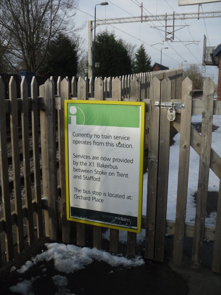 Barlaston, like Norton Bridge, lost its trains in 2003, and it exists in a similar twilight world of permanent bustitution. Unlike Norton Bridge, there are signs and noticeboards to acknowledge the station’s existence. However, padlocked gates prevent any access to the platforms themselves. The station nameboards are still there, slowly fading, and an attractive-looking waiting room on the Stoke-bound platform stands disused and forlorn.