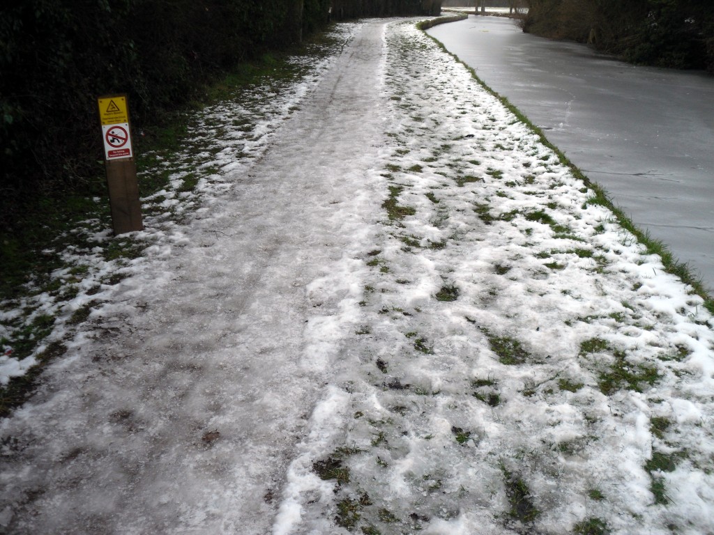 Photo showing iced-over canal towpath in BarlastonWe pressed on, walking on the grass verges in parts where the towpath was just too dangerous. We passed a few other hardy souls, mostly dog-walkers (judging by the amount of excrement we dodged, this is a popular dog-walking route). There were alarming signs at regular intervals, warning anglers to avoid this stretch of canal, lest their rods get tangled in the overhead power cables strung in the adjacent field.