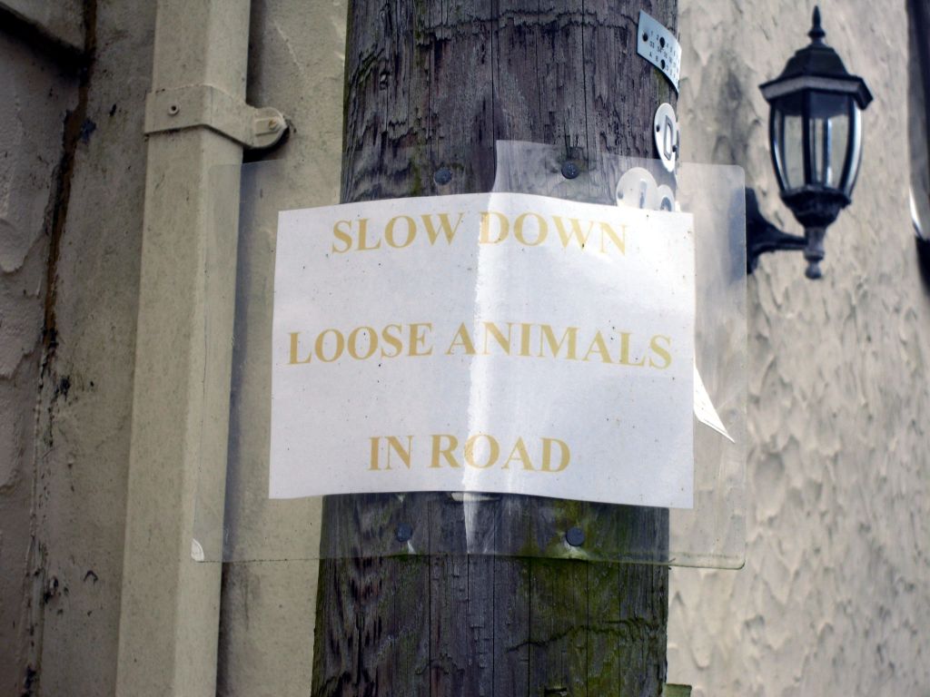 Photo of faded home-made sign riding "SLOW DOWN - LOOSE ANIMALS IN ROAD"There is also a small farm offering free range eggs to passing trade (assuming they get passing trade). The packs of eggs were simply left in a box outside the front door of the building, with a note saying “post payment through letterbox” – a level of trust incomprehensible to this cynical city-dweller. A faded, home-made sign warned of “loose animals in the road”, but I didn’t see any.