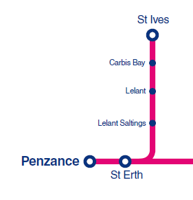 Map of the St Ives Bay LineMy final day in Cornwall and I aimed to capture the St Ives Bay Line. This short (4¼ mile) line branches off from the Cornish Main Line at its penultimate station, St Erth, and winds its way up to the town of St Ives. Although the end-to-end journey time is only about 15 minutes, it has a reputation as one of the most scenic lines in Britain, and I was keen to see for myself.