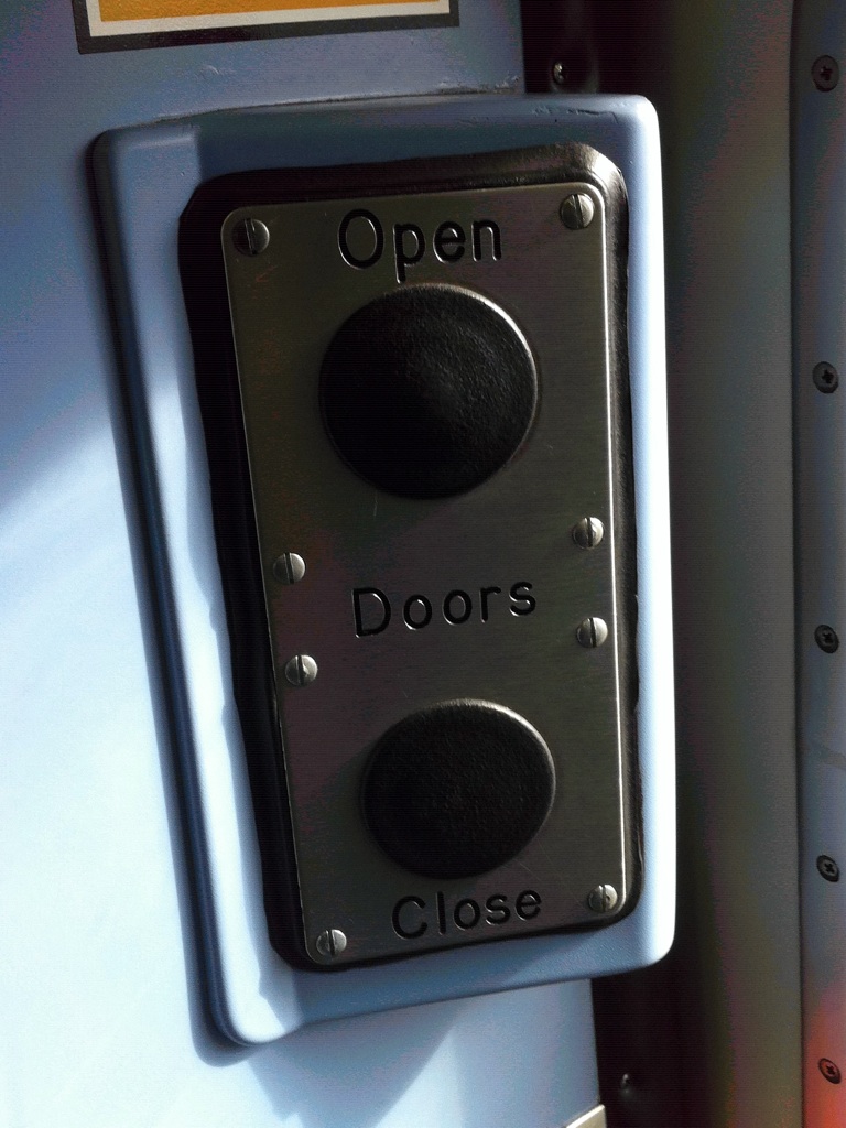 Door buttonsI put on a brave face, but as the driver announced again that we were being held at a red signal, I did start glancing at my watch anxiously. Fortunately, once we transferred to the Victoria Line, with its computer-controlled trains that go like a bat out of hell (technical term), we found ourselves whizzing along, and we reached Tottenham Hale with time to spare.