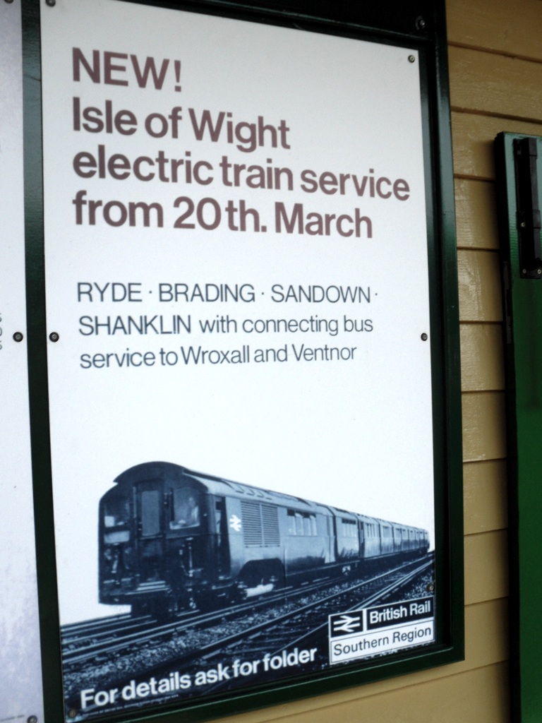 I gratefully fell out of the train at Smallbrook. I took a moment to appreciate the historic British Rail poster displayed on the platform, proudly boasting of the new electric train service (and downplaying the fact that they were using knackered tube trains). I then dragged myself back over to the Island Line platform, where – for completeness – I got a photo of myself next to the name board on this side of the station.