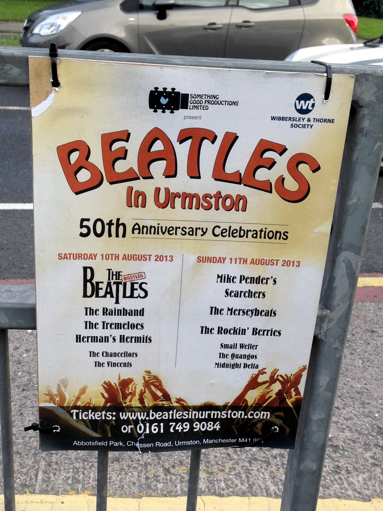 There’s more to the area than Old Trafford football ground, of course. As we strolled along the main road, we saw posters advertising “The Beatles in Urmston” (which we had unfortunately missed) and this intriguing Post-It note inviting us to “Belle Vue Vinyl Night”. Scott was fairly sure that the vinyl in this case was referring to LPs and this was not some sort of specialist fetish night (despite the “Entrance at Rear” tagline).