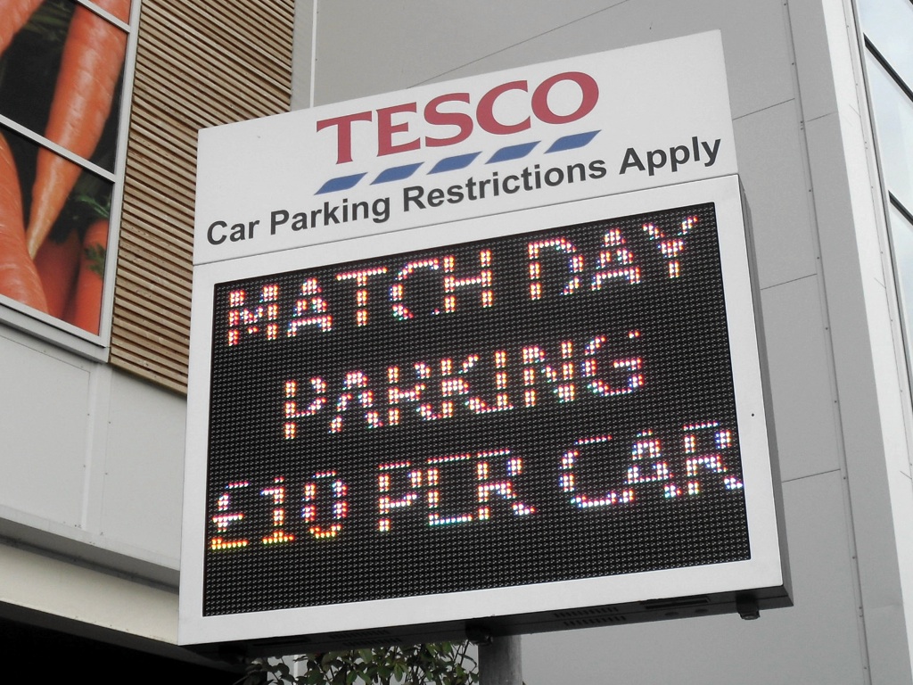 It’s not all bad news for the locals, however – they can, of course, milk the fans for some cash. Near the ground is a Tesco superstore, which was charging £10 (ker-ching!) for match day parking. Across the road, someone was selling supporters scarves to passers-by. He had laid his wares out neatly on the grass verge. As Scott pointed out, from a distance it just looked like a memorial to someone who had been run over at the road crossing.