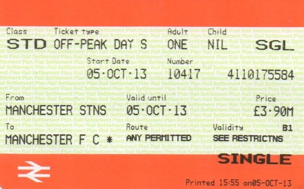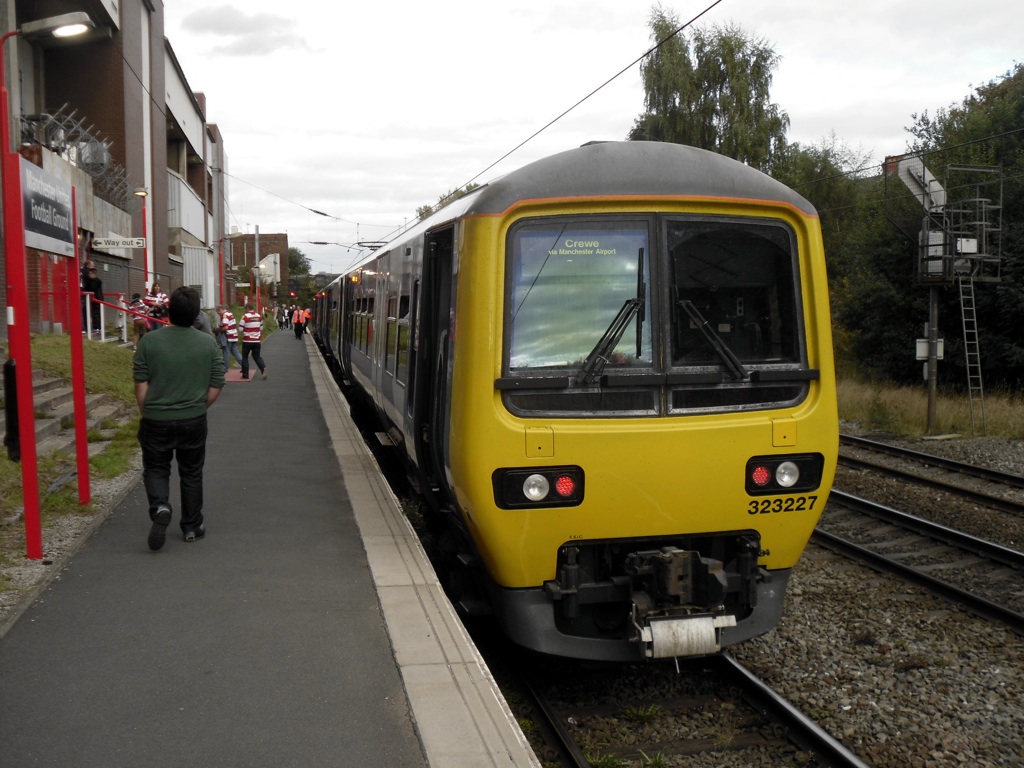 The journey from Liverpool was uneventful enough, and we arrived at Manchester Piccadilly with half an hour to spare before the train to the ground. This gave us more than enough time to buy our tickets – through tickets to the ground are only sold from a handful of stations in the GMPTE area, and day rangers etc are not valid. Oddly, Northern Rail’s ticket machines didn’t acknowledge the existence of the station, whereas Virgin’s did, and happily sold us a ticket.