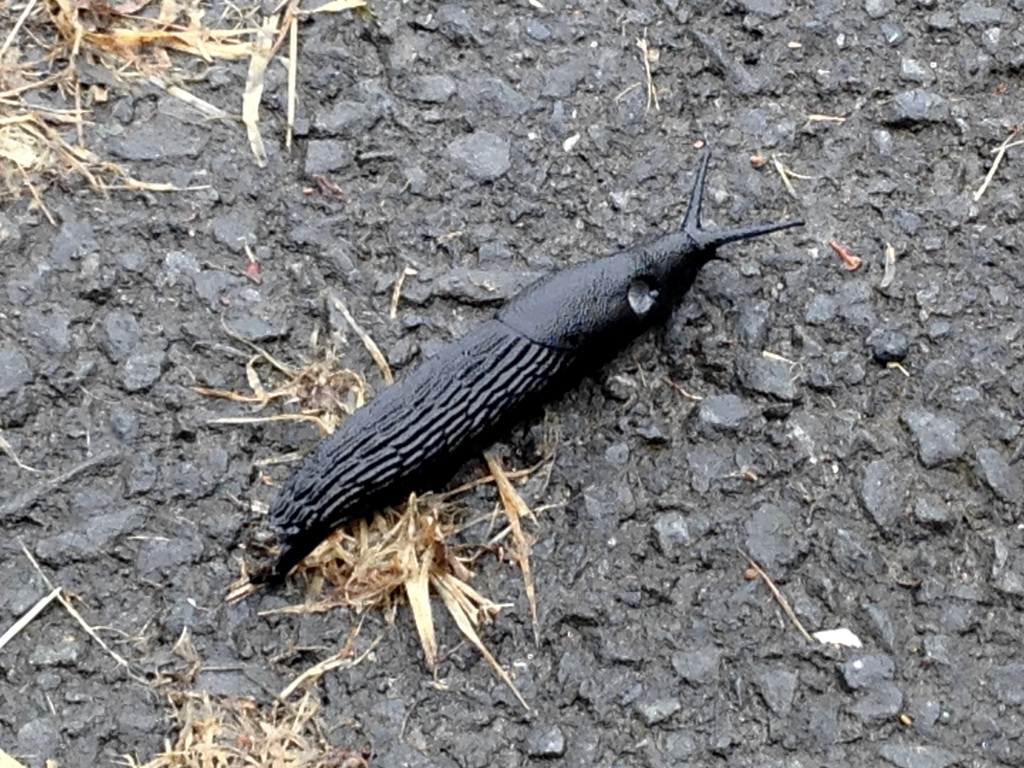 I noticed a big slug, no doubt enticed out into the open by the damp conditions, making its slow, slimy way across the pavement.