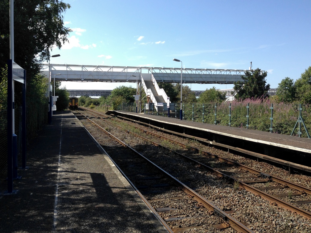 The “onward travel” poster gives the names of local taxi firms. This is rather optimistic – it’s unlikely a taxi would be able to get anywhere near the station. The road leading to the station, the romantically-named Oil Sites Road, is closed to all traffic except that on refinery business. Even the rail replacement buses have to drop off on the roundabout outside the complex. There is still a foot/cycle path open to the public, but it’s a long walk from here to anywhere.